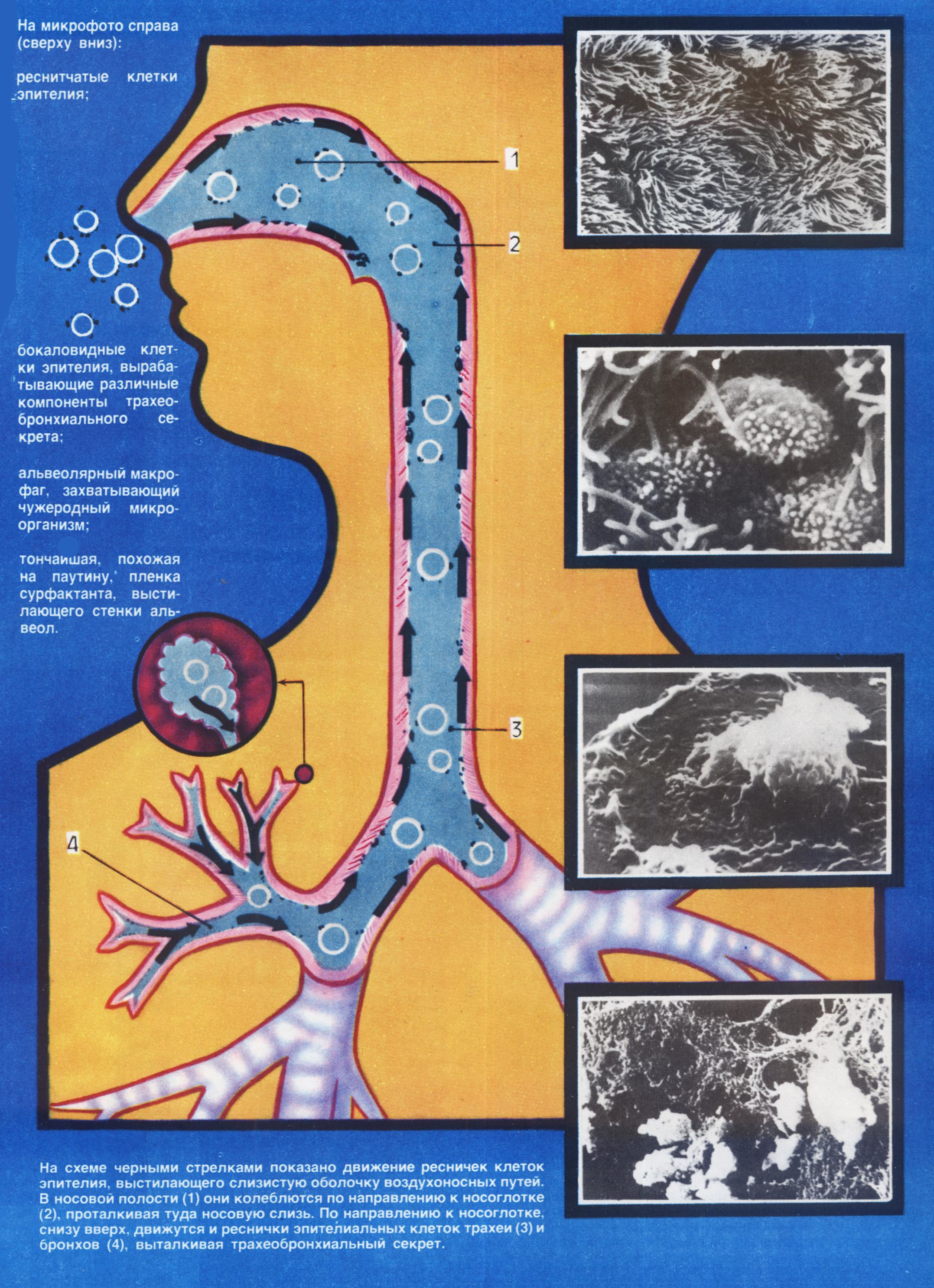 А более мелкие проникают глубже — в трахею, бронхи, где очистка воздуха продолжается как за счет функции реснитчатого эпителия (реснички эпителиальных клеток движутся снизу вверх, выталкивая секрет в носоглотку), так и благодаря наличию трахеобронхиального секрета.